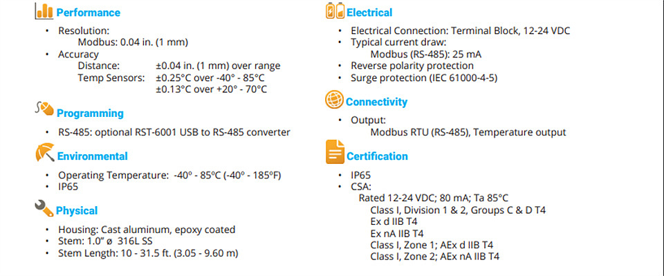 MPX 系列 API 18.2 Custody Transfer 磁致伸縮液位傳感器提供高度準(zhǔn)確和可重復(fù)的液位和溫度讀數(shù),用于儲油和從租賃油罐中輸送。MPX-R 提供直徑為 1 英寸的不銹鋼閥桿,而 MPX-T 使用直徑為 1 英寸的鈦閥桿以實現(xiàn)更大范圍的化學(xué)兼容性,包括 H2S。所有型號都在閥桿中配備了所需的數(shù)字溫度傳感器,并具有堅固的浮子,可防止結(jié)垢和堆積。