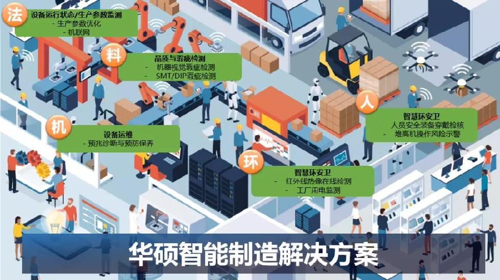 ASUS IoT針對工廠之人、機、料、法、環的需求,分別開發人員安全警示、設備預兆診斷、質量瑕疵檢測、生產運行監測、環安警示監控等各類方案。藉由AI的助力,解決金屬、塑料、風扇、印刷電路板等計算機周邊組件生產及系統組裝作業所面臨的生產與環境問題,推動智能制造解決方案,對制造領域進行全面性的數字化智能化升級,實現工業4.0所需要的彈性、速度、生產力和質量力。