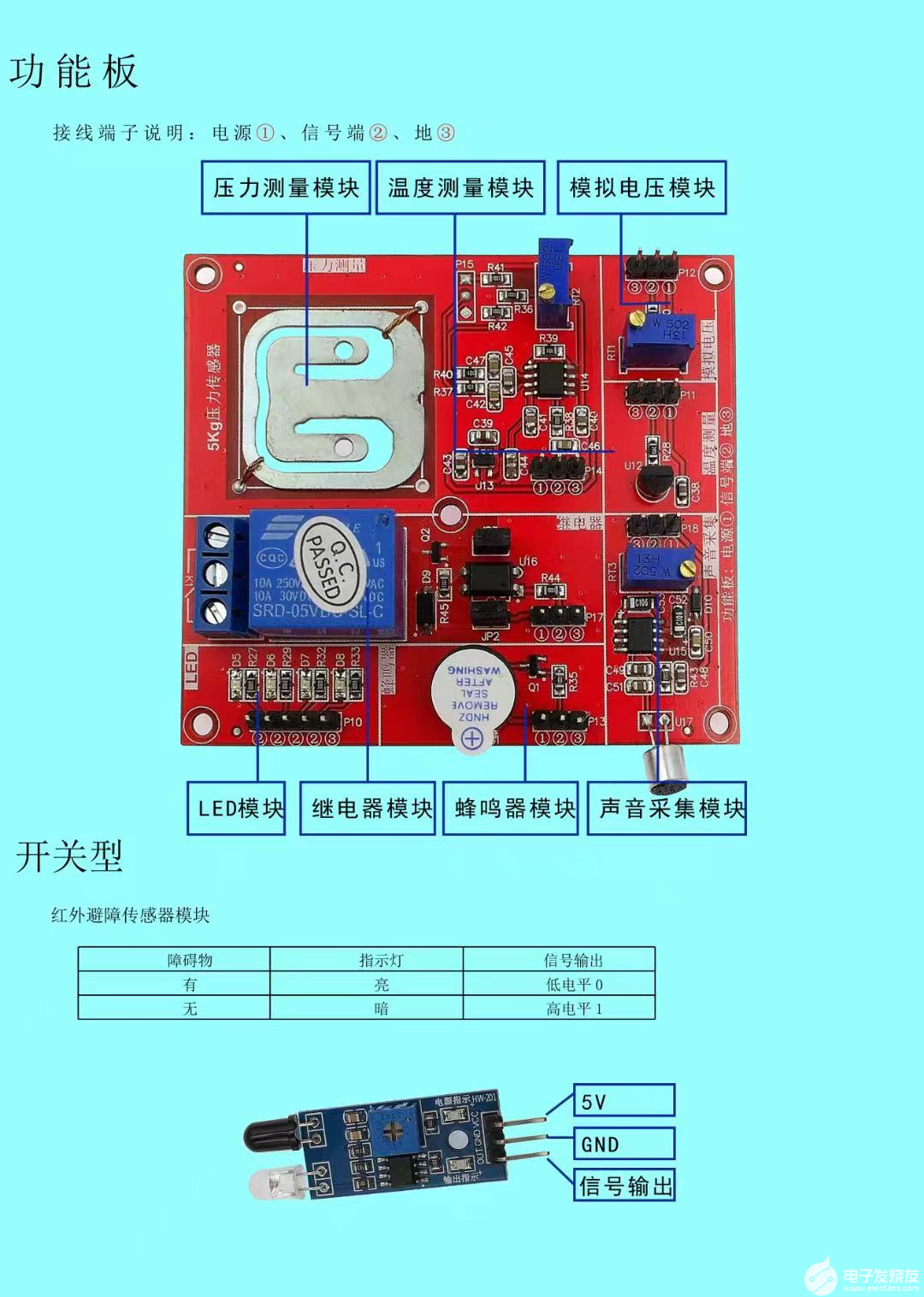 壓力測(cè)量模塊,模擬電壓模塊 ,蜂鳴器模塊,溫度測(cè)量模塊,聲音采集模塊,繼電器模塊 ,指示燈模塊