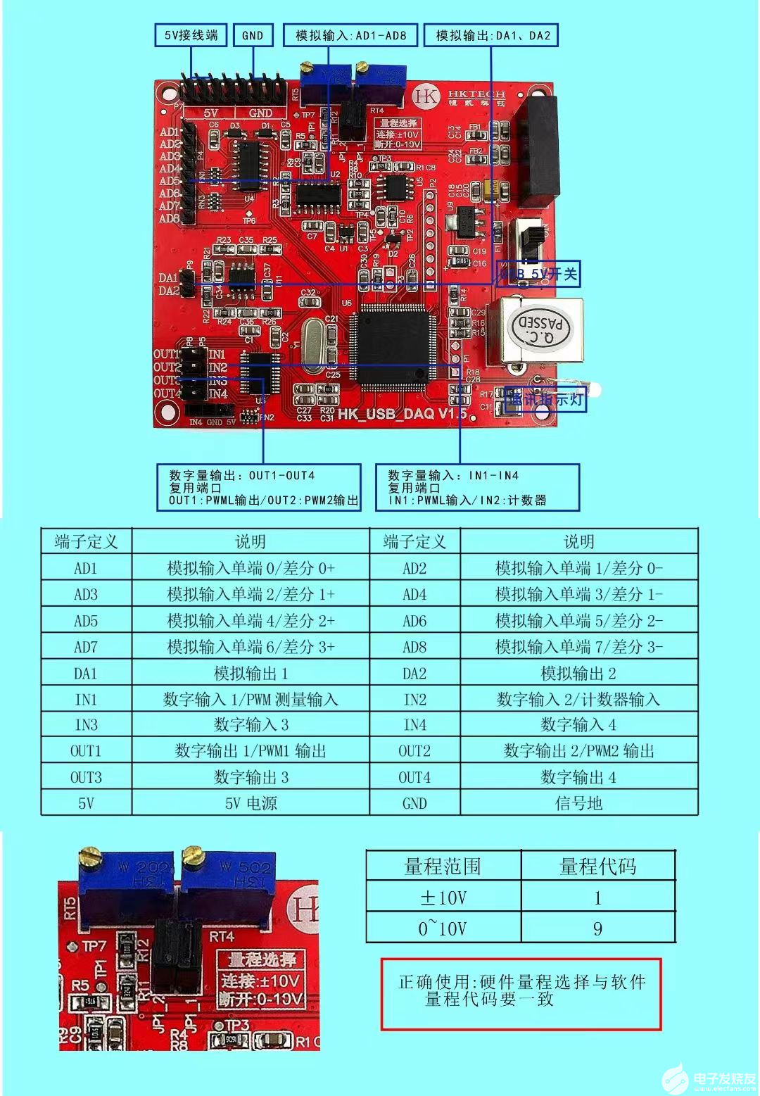 12位分辨率,100K采樣頻率,最大量程±10V多量程可選擇,8路單端AD(AI)模擬輸入,2路DA(AO)模擬輸出,1路PWM輸入,2路PWM輸出,1路計(jì)數(shù)器輸入,4路IN(DI)數(shù)字量輸入,4路OUT(DO)數(shù)字量輸出