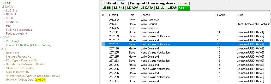 空中sniffer抓包看的話,就能看到這兩個使能notification的流程: