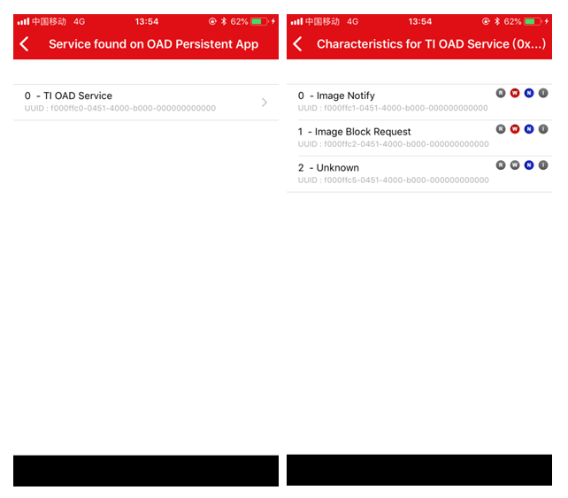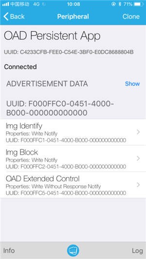 App連接上設(shè)備之后,就能發(fā)現(xiàn)OAD的service和characteristics(服務(wù)和特征值):