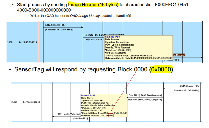 如果發(fā)現(xiàn)image header中的版本號確實比自己本身的固件版本號要新,那么就同意這次固件更新,會在OAD Image Block這個特征值的notification (這里notification是在前面第一步使能)上回復(fù)0x0000,表示準(zhǔn)備接受序列號第0個固件內(nèi)容包。注意實在OAD Image Block這個特征值上,不是OAD Image Identify這個特征值上,OAD Image Identify這個特征值的使命在前面已經(jīng)完成,后面不會再使用。